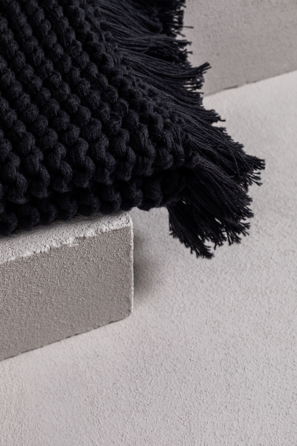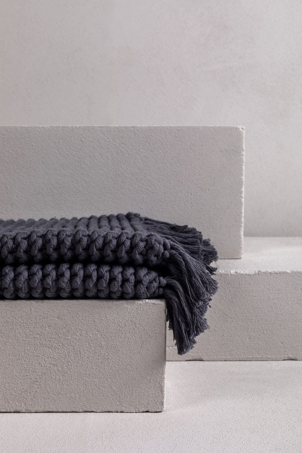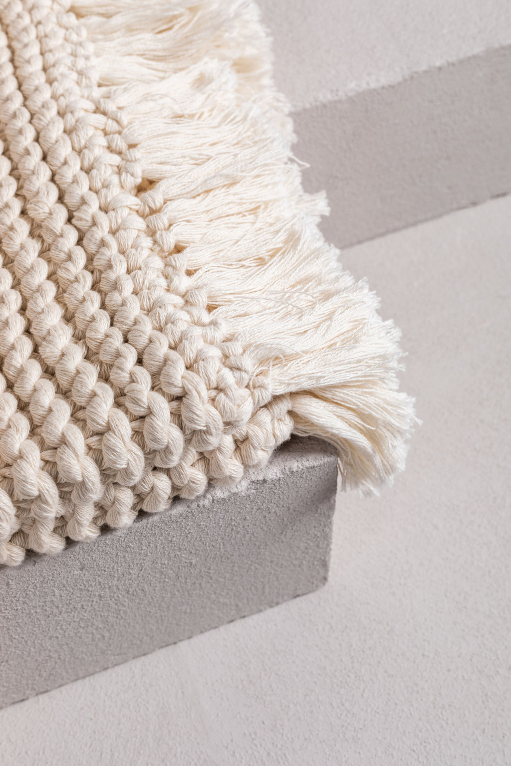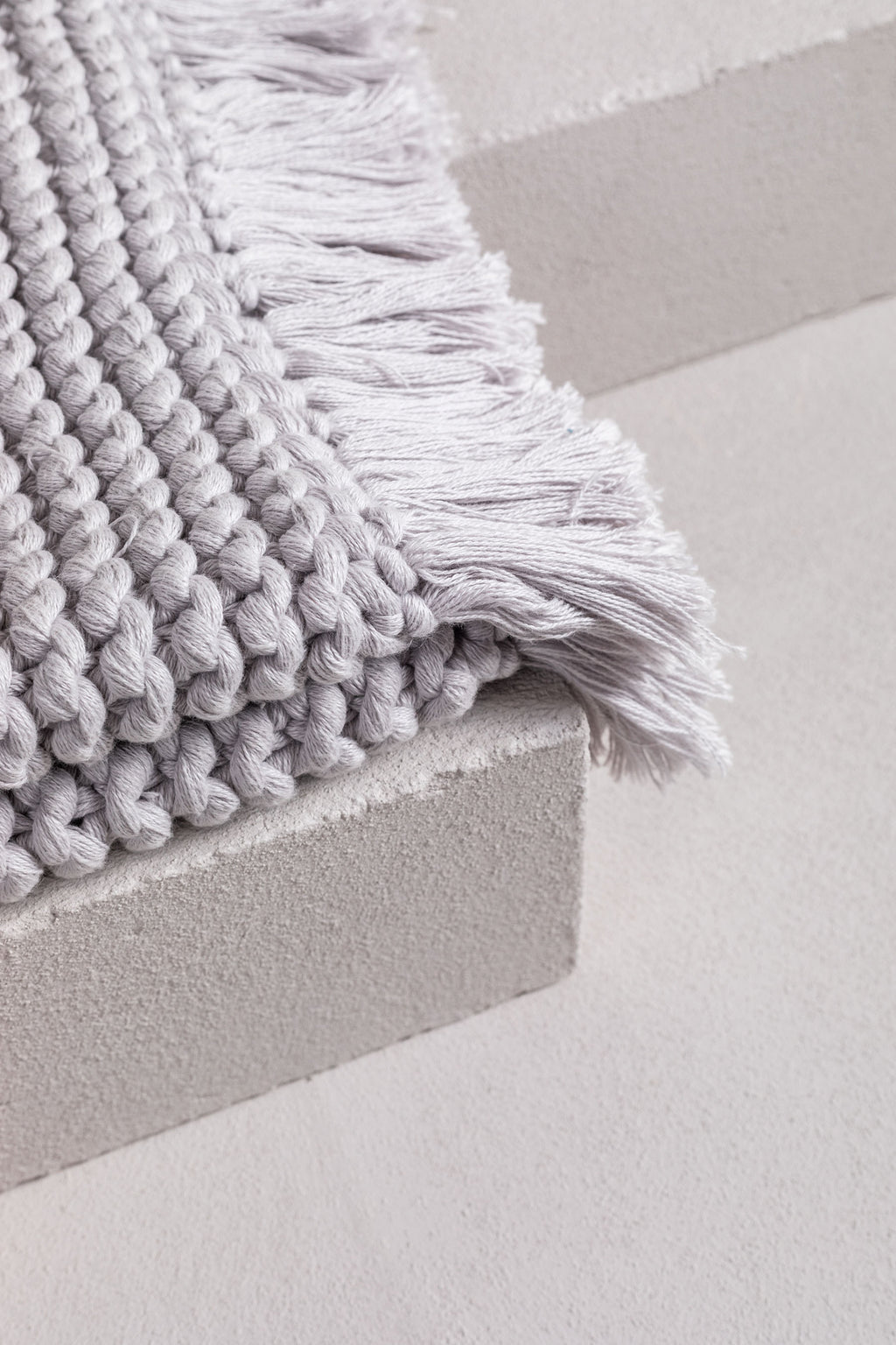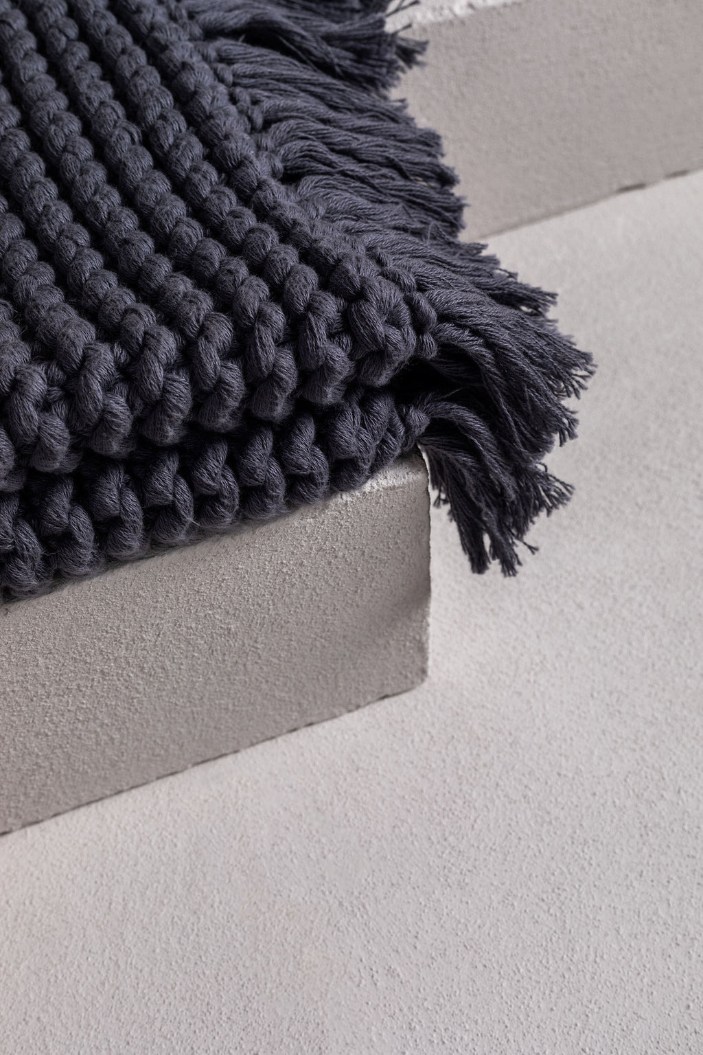 this gorgeous product is a hand-crafted bathmat or bath rug and is made exclusively for bedouin SOCIETE. many yarns form the one strand then hand knitted into a modern chunky soft tactile piece. -