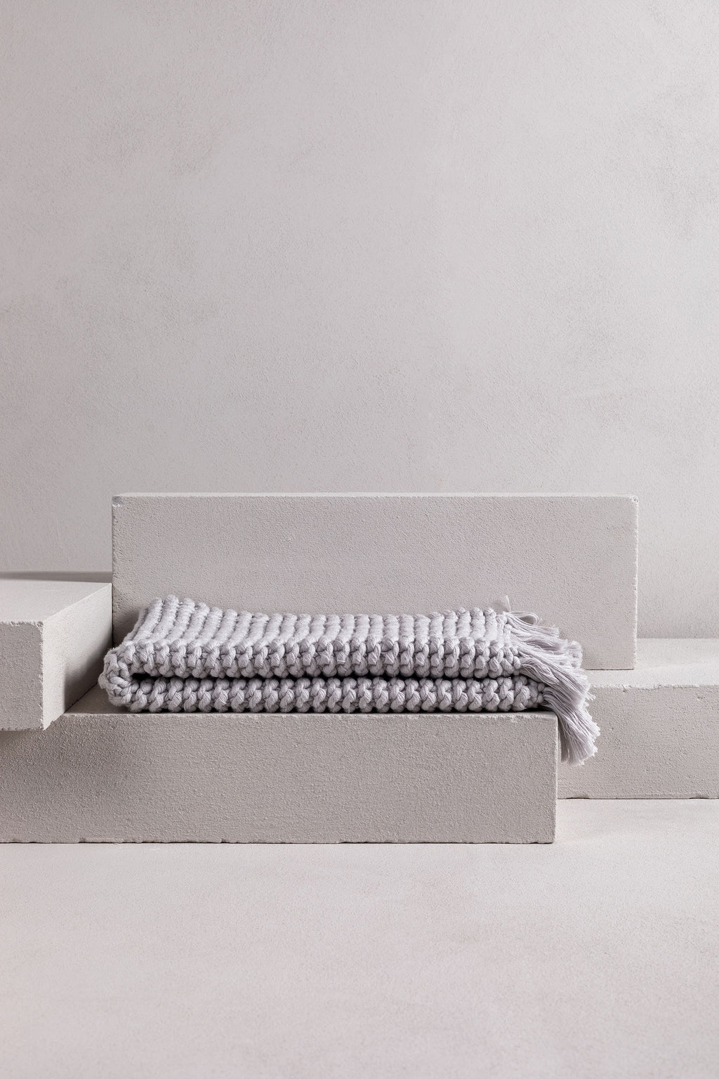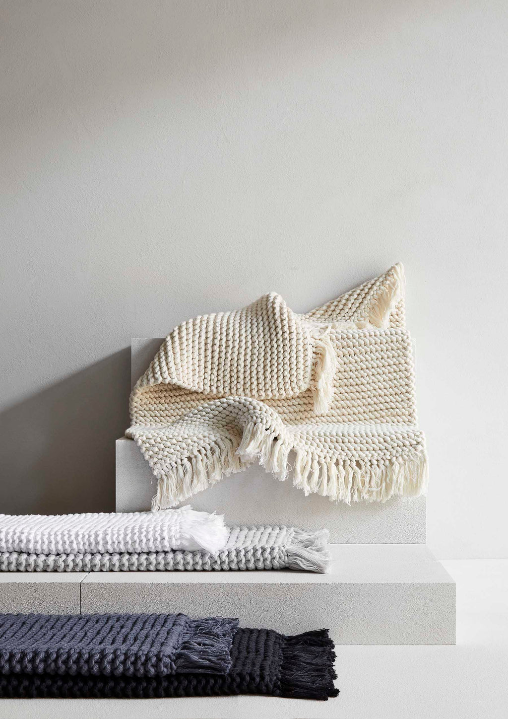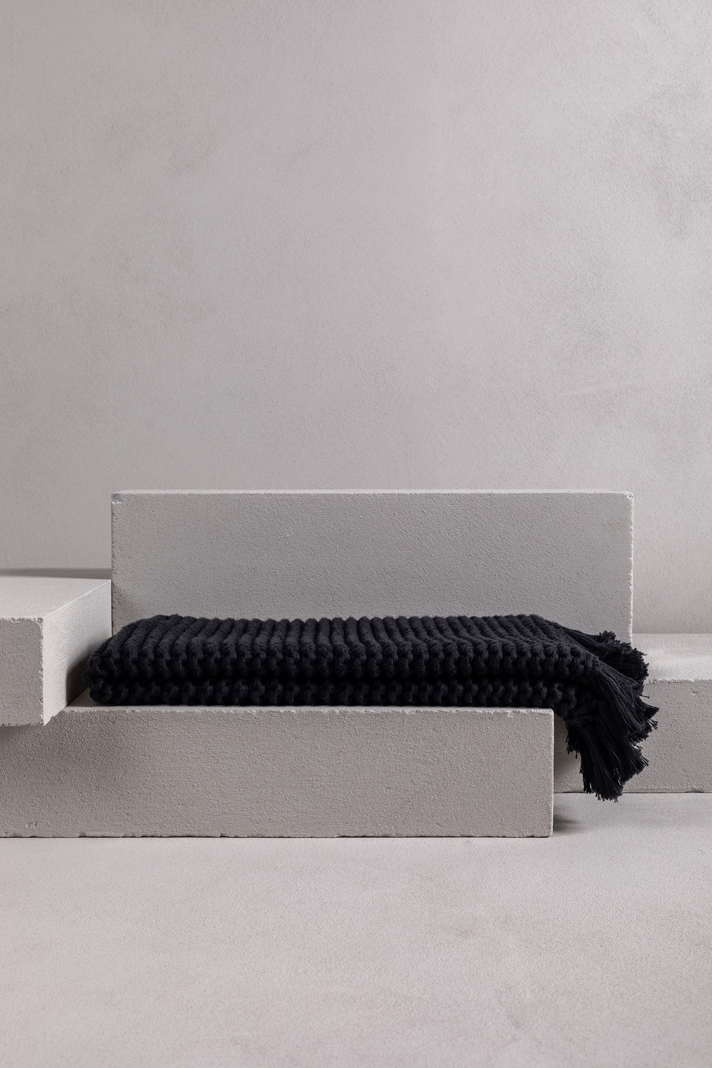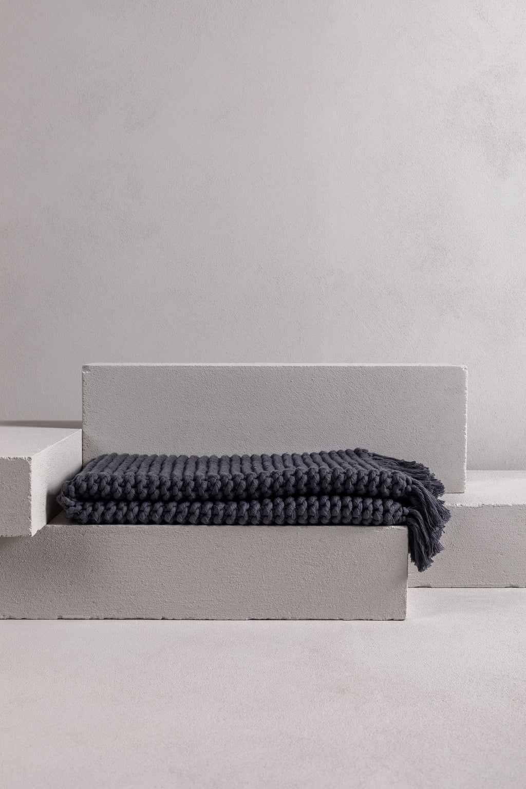 this gorgeous product is a hand-crafted bathmat or bath rug and is made exclusively for bedouin SOCIETE. many yarns form the one strand then hand knitted into a modern chunky soft tactile piece. -