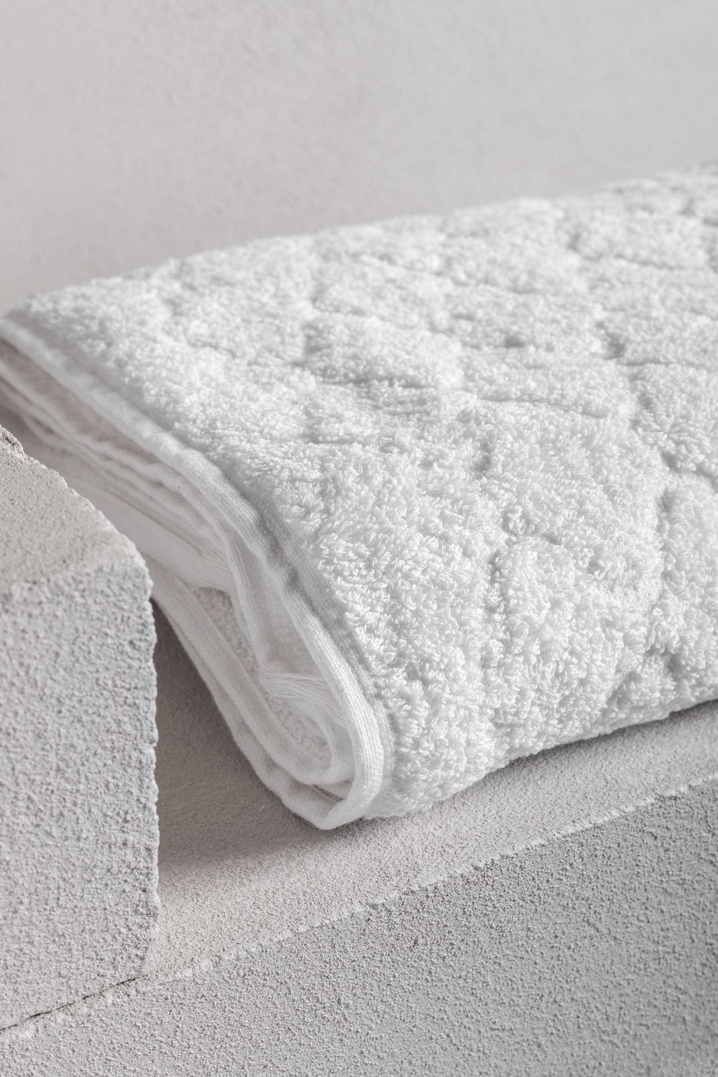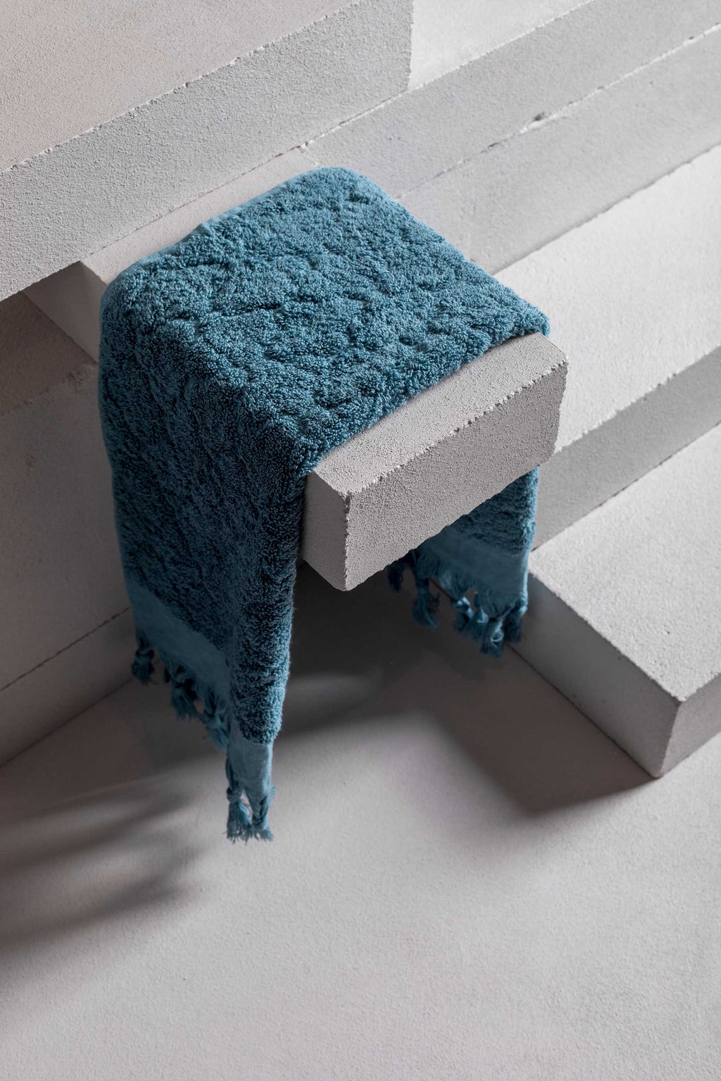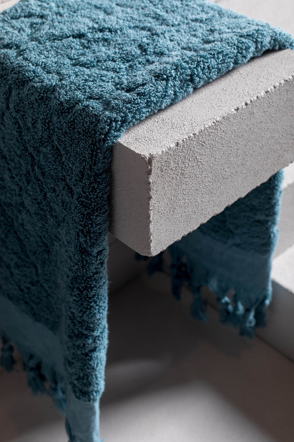 MOROC, the decorative but subtle design is inspired by the geometric, repetitive and symmetrical motifs, created by moroccan artisans and found in the salons, courtyards and bathrooms of that region. it is woven on traditional old looms to produce a rich, textural handmade product that is reminiscent of hand work by the artisans. it is a thick, plush, premium quality towel. pattern is one side only with a plain loop on the other.