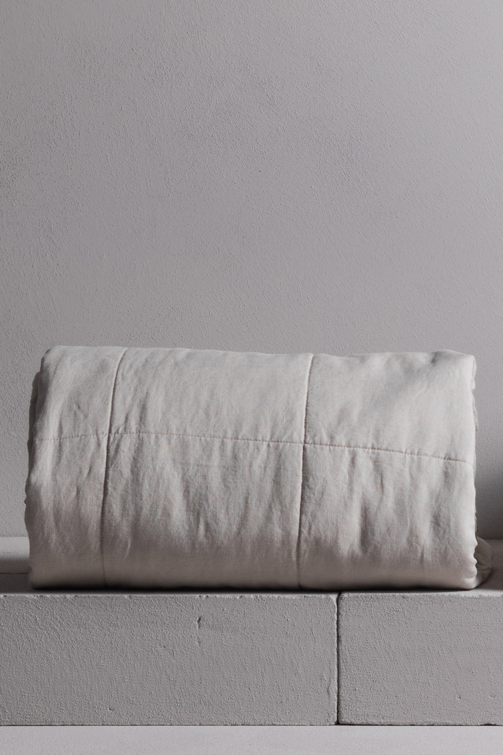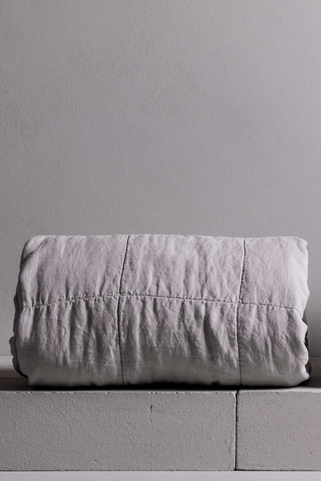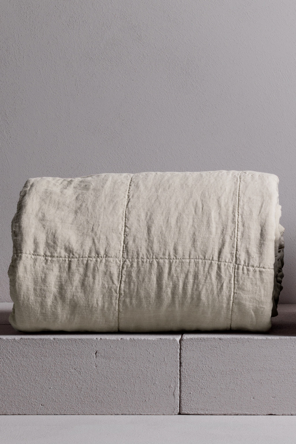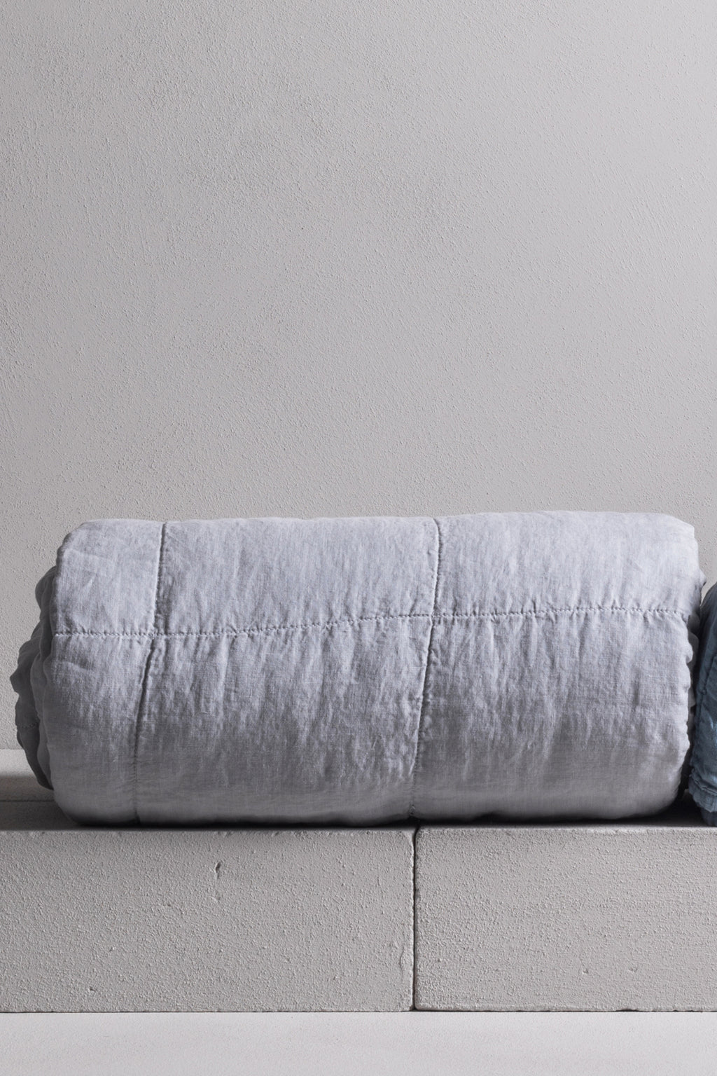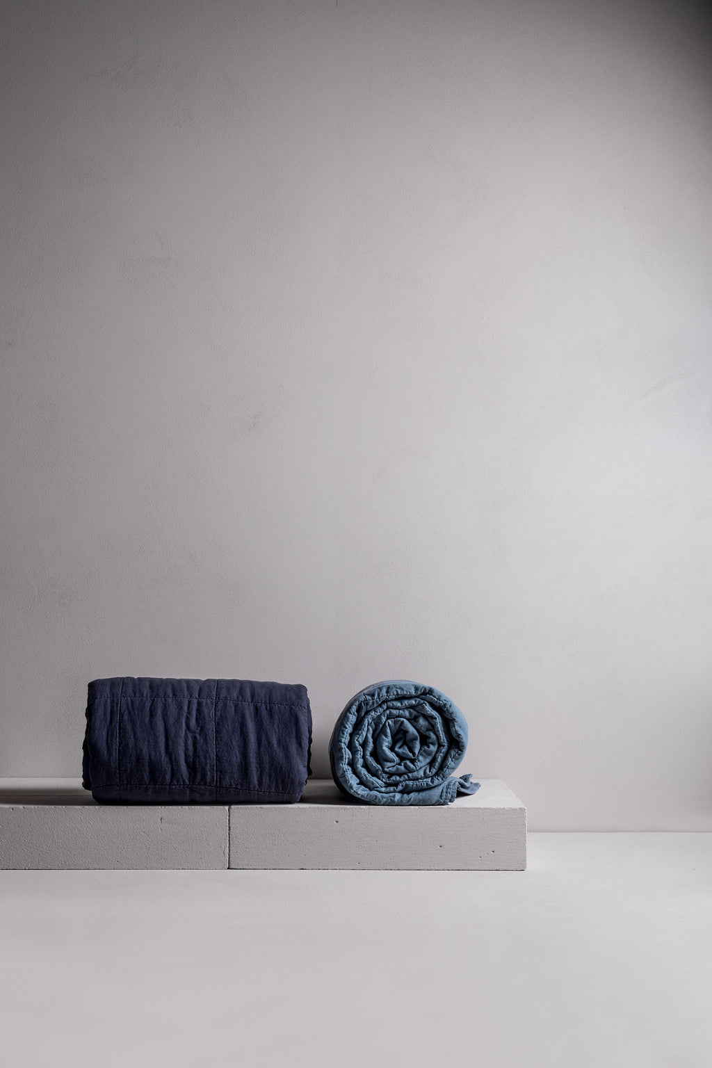 the MINERALE pure linen vintage wash stitched quilt is from the family of our MINERALE vintage wash sheeting. it is the outcome of an artisanal process that achieves a lovely matte hand-dyed finish; it relaxes the fibres to produce a soft handle and highlights the subtle colour palette that is a signature of bedouin SOCIETE. the fill is cotton.